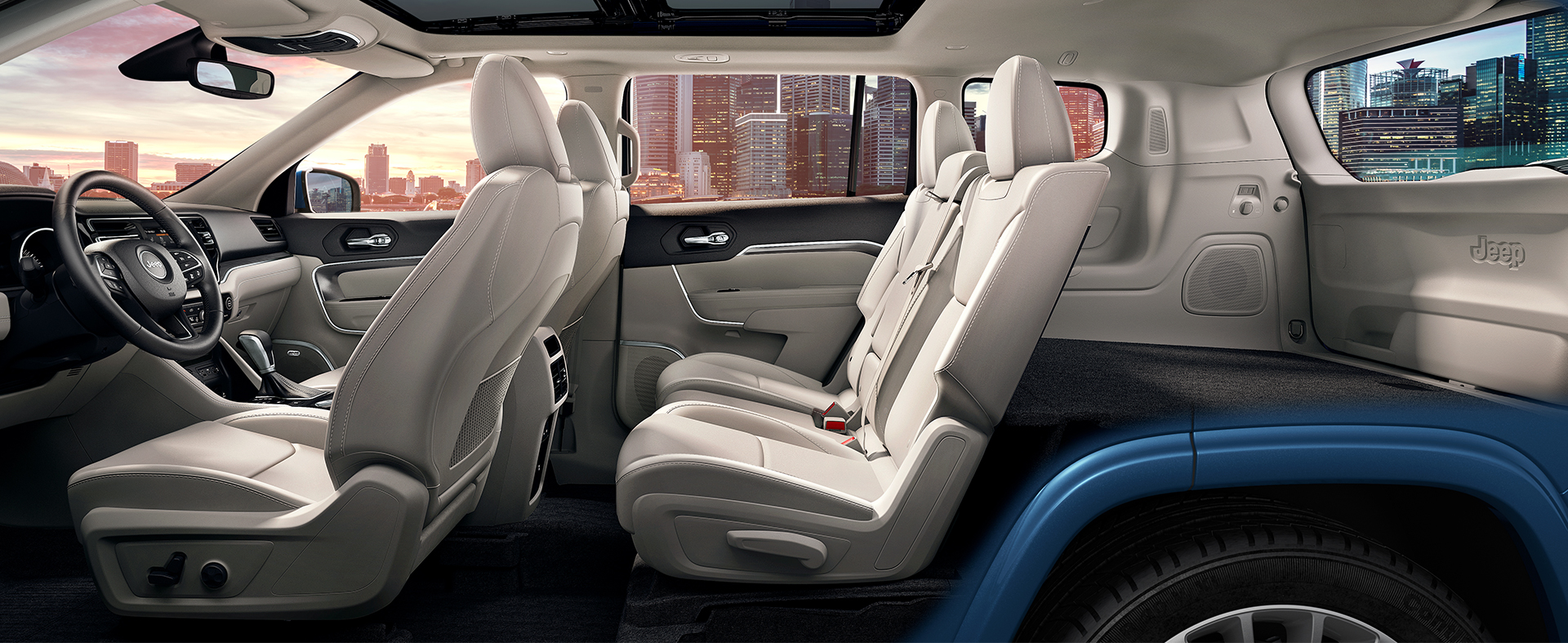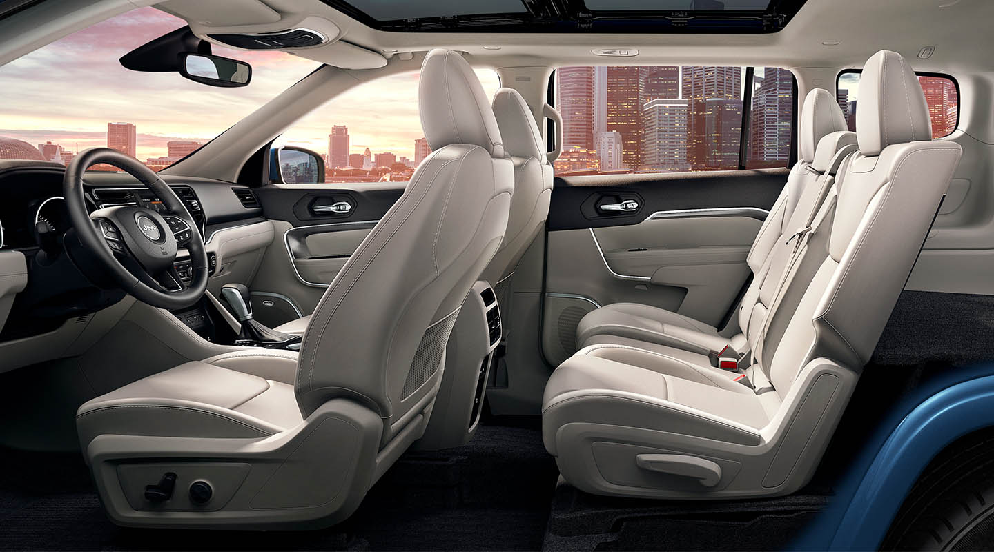 On the interior, all Commander models come standard with leather wrapped steering wheel, shifter lever, and luxury leather seat (top-trim levels get Nappa Leather seating). Also standard are 8-way power adjustable driver and passenger seats with 4-way electric lumbar support. Most trims come standard with front heated seating as well.