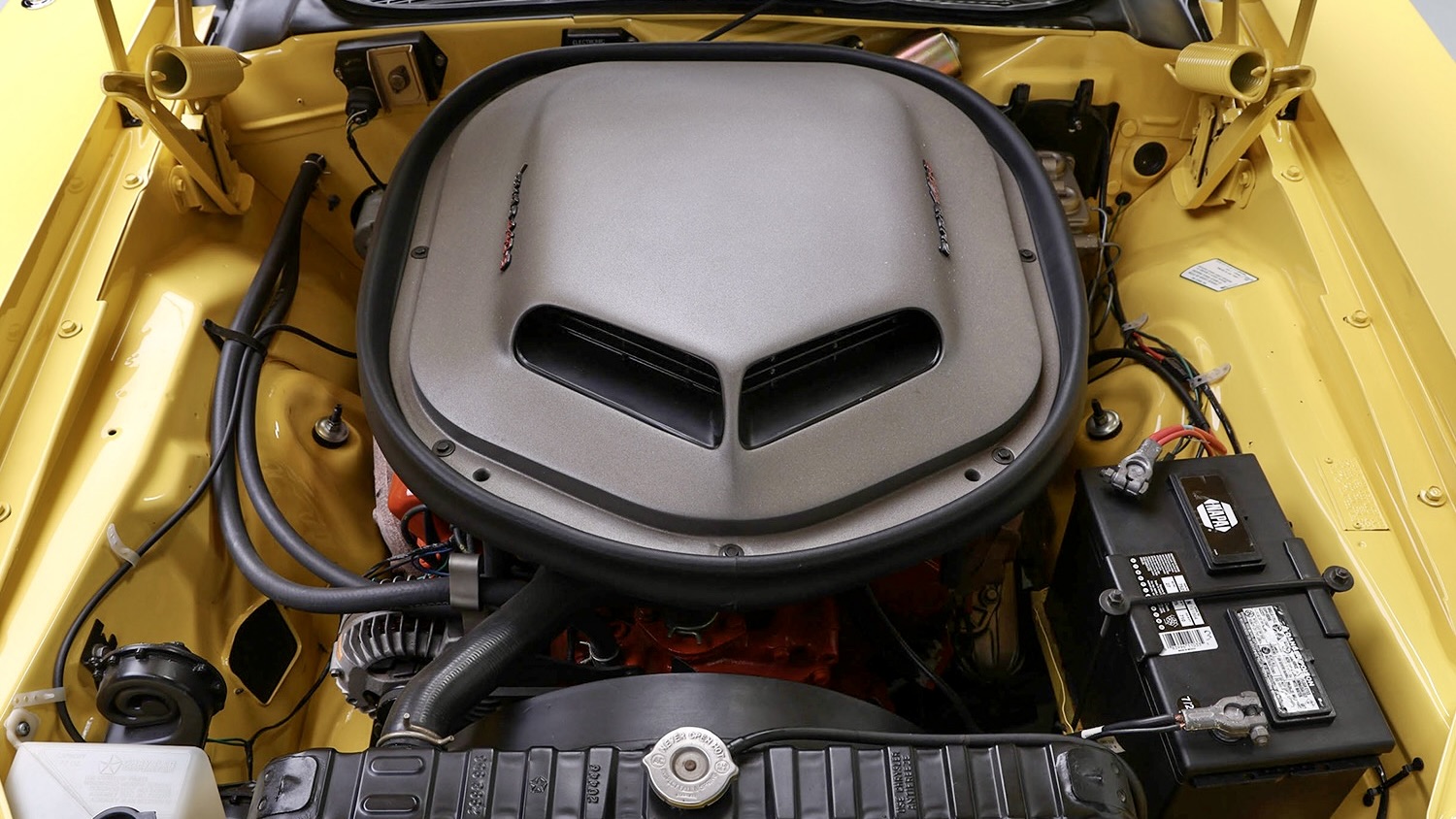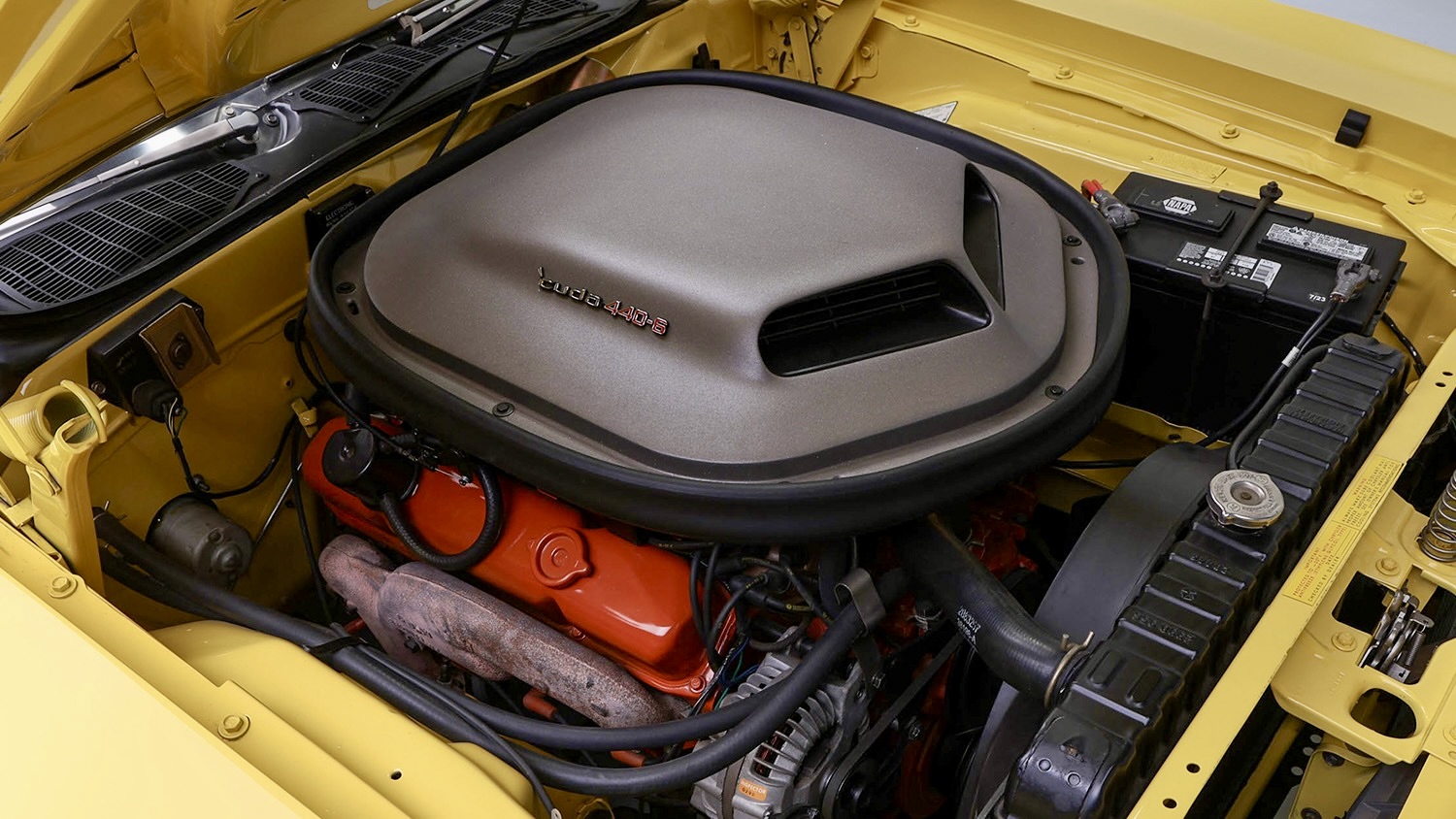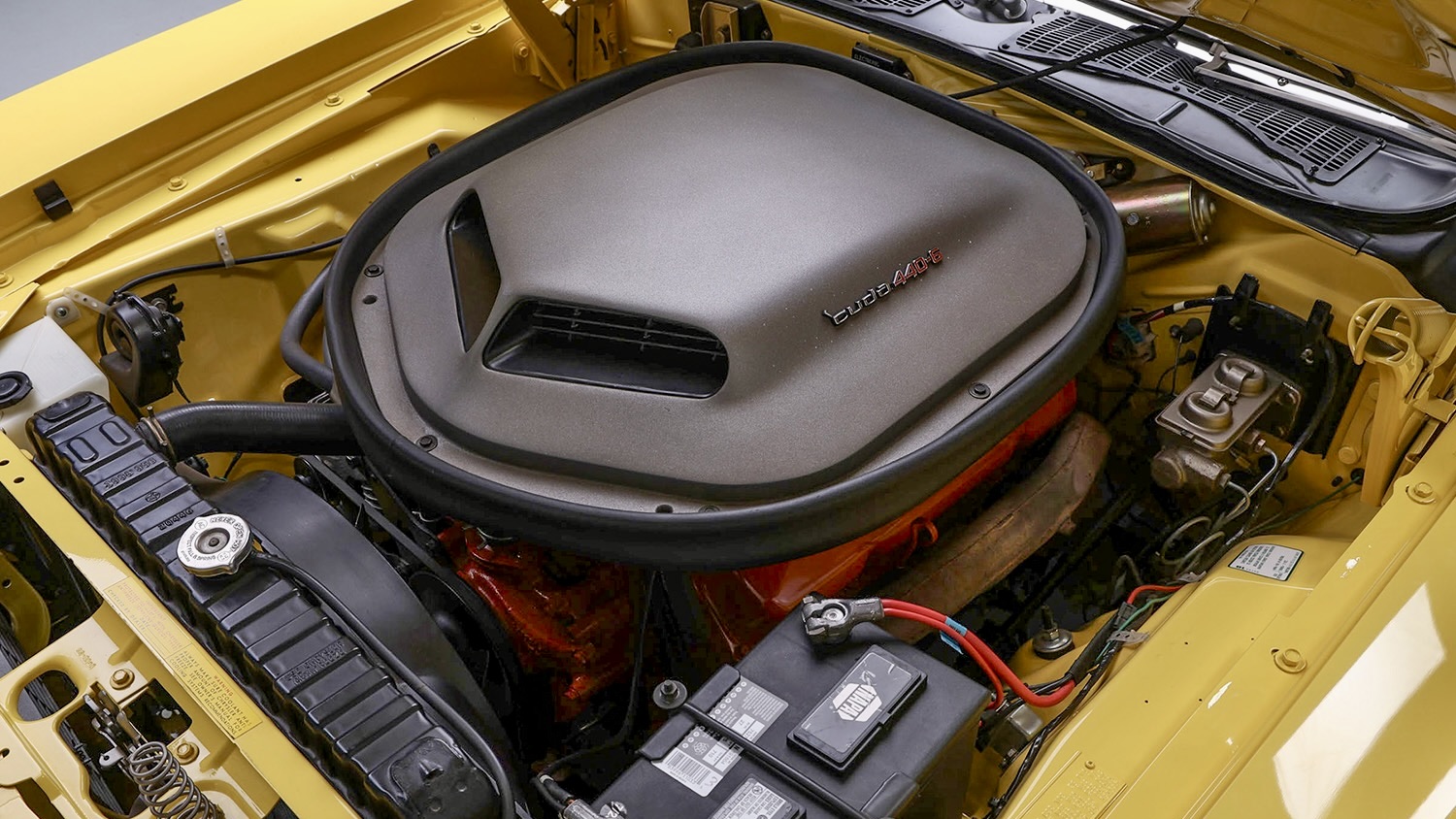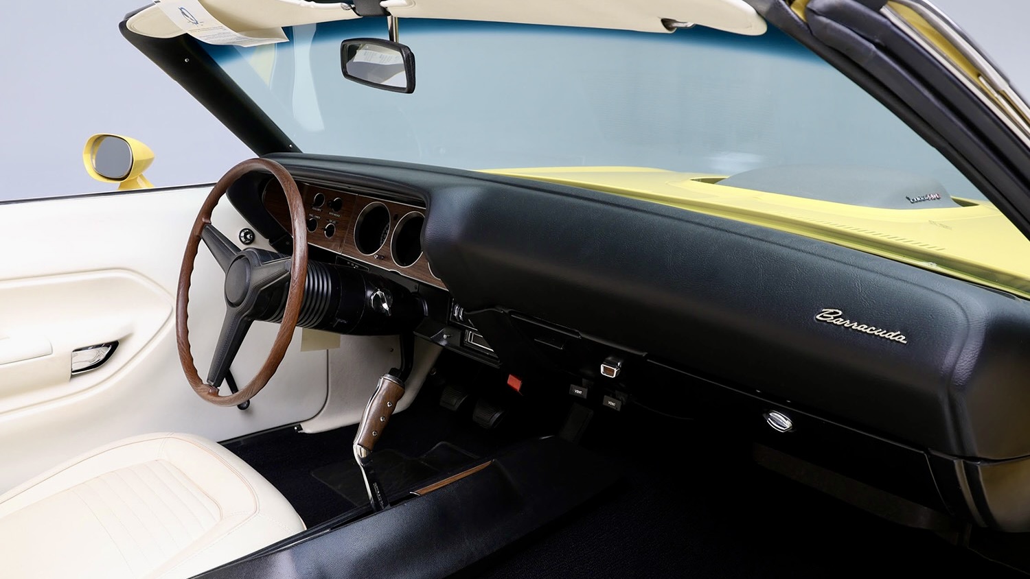 This ’Cuda received a full rotisserie restoration and keeps its factory powerplant: the legendary 7.2-liter (440 cubic-inch) Six-Barrel V8, rated at 390 horsepower when new. The triple Holley carb setup made these big-block Barracudas absolute street animals in their day. Even better? This car was ordered with the 4-speed manual transmission and pistol-grip shifter — the enthusiast’s choice for wringing out every bit of that Six-Pack power.