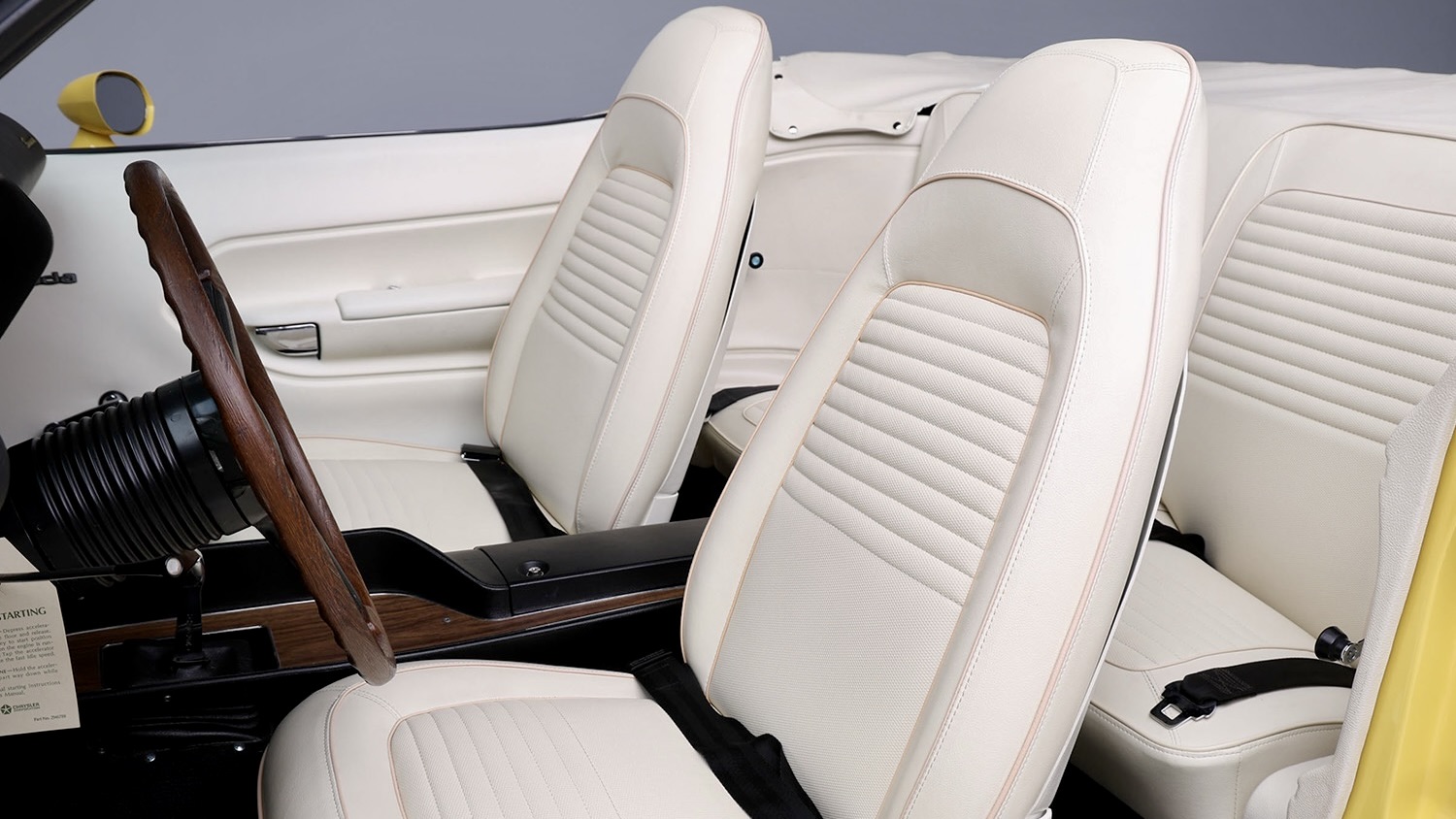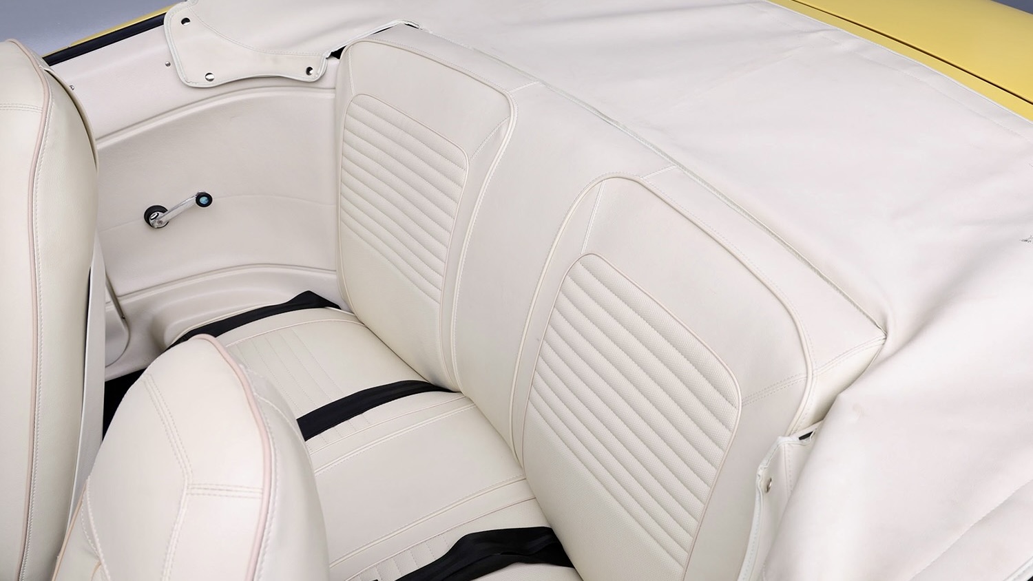 From the outside, the car is all attitude. The Lemon Twist paint (code FY1) is complemented by a power white convertible top and bright exhaust tips poking out below the rear bumper. Factory hood pins, painted dual mirrors with a remote driver’s side control, body sill moldings, and deck lid trim complete the classic look.