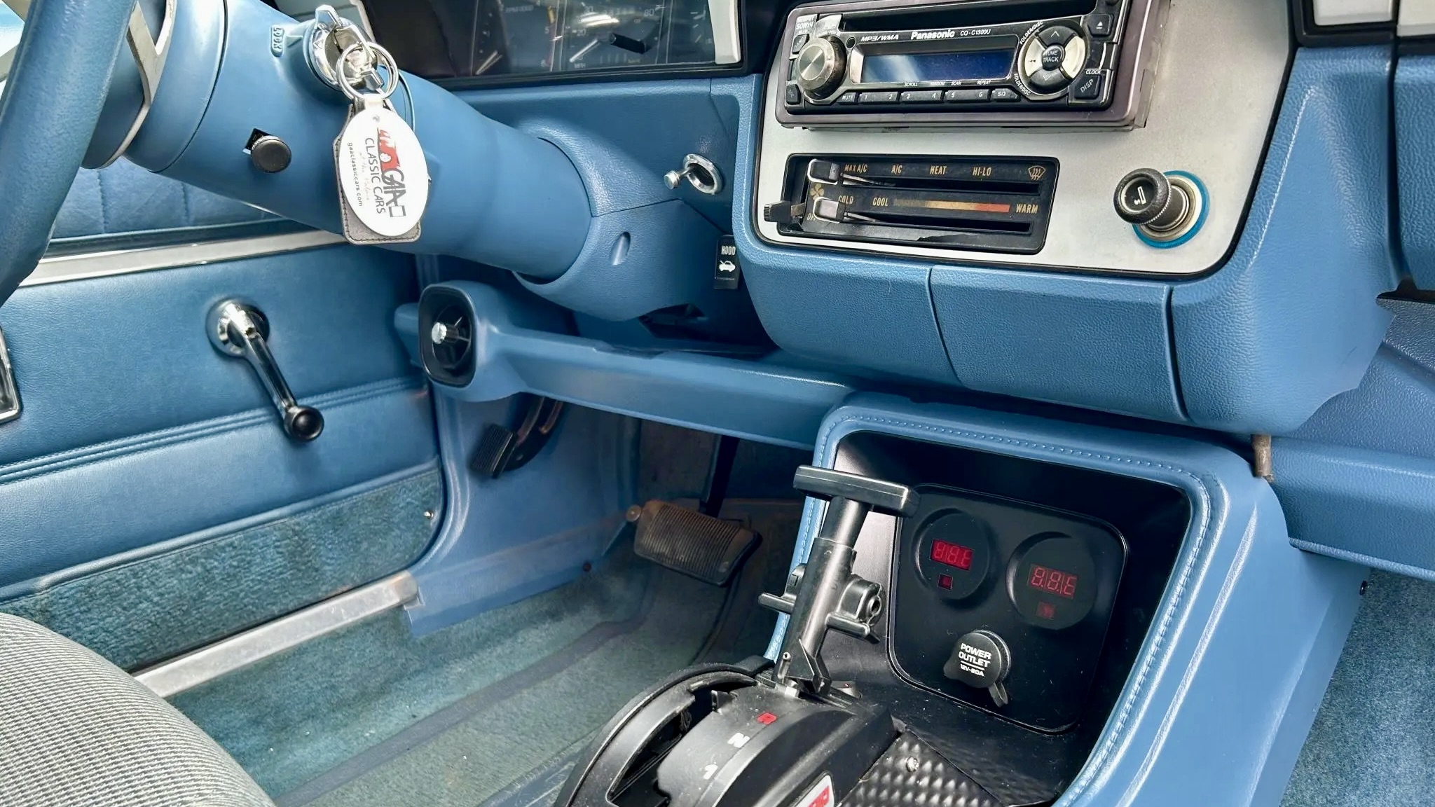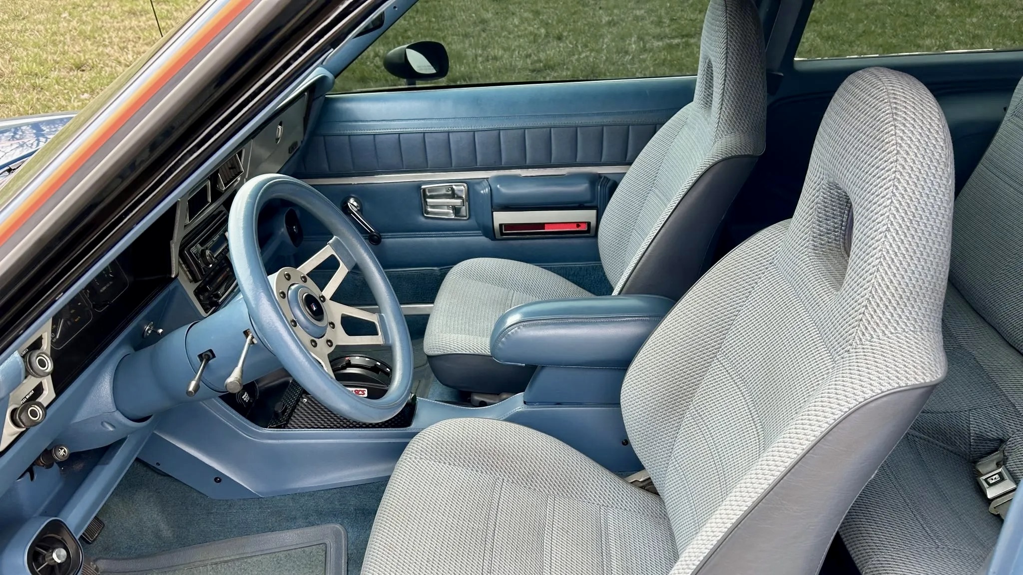 Inside, the cabin blends original Spirit styling with some driver-focused upgrades. Gray-patterned cloth seats and blue interior trim keep the vibe vintage, while a Cheetah SCS reverse-pattern shifter gives a clue that the transmission isn’t stock. A set of center-console-mounted digital auxiliary gauges, air conditioning, tinted windows, remote trunk release, and a Panasonic CD stereo add comfort and usability. The odometer shows 83k miles, though only a handful have been added by the selling dealer since it arrived from North Carolina late last year.