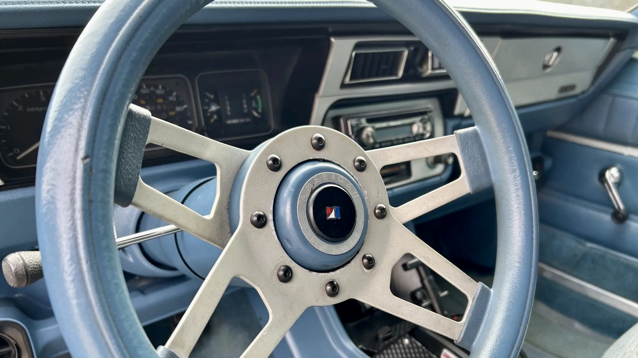 Visually, this AMX leans into the bold late-70s performance look—front air dam, flared fenders, and a rear spoiler set the tone. It left the factory in Olympic White but has since been resprayed in a sharp shade of blue, accented with retro multi-color striping. The black-finished US Mags 15-inch wheels, lowered suspension, and upgraded sway bars give it an aggressive stance and improved handling. Power-assisted front disc brakes help rein things in when the big AMC V8 gets feisty.