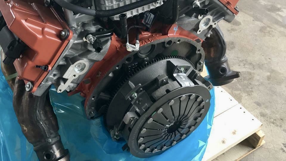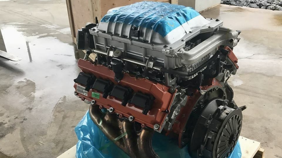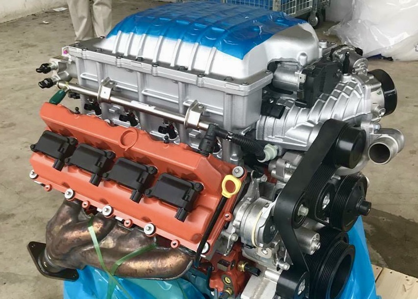 The top of the engine is dominated by a 2.4-liter IHI twin-screw supercharger, spinning at up to 14,600 rpm and feeding air through an air-to-water intercooler. The 9.5:1 compression ratio helps keep detonation in check, while the hemispherical aluminum cylinder heads allow efficient airflow and explosive combustion.